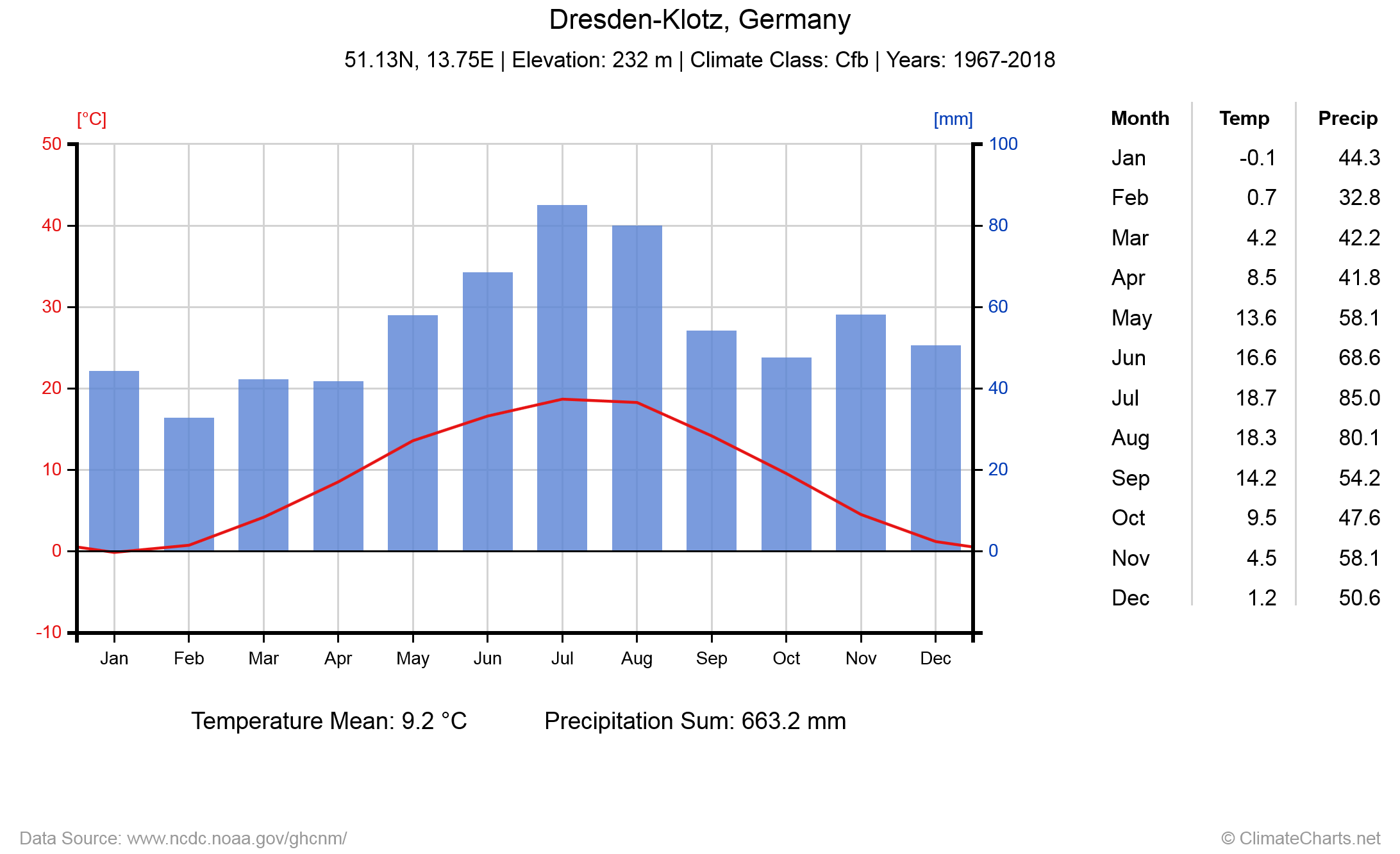 Die Durchschnittstemperatur liegt wie in Mitteldeutschland zwischen 8°C und 10°C. Im Elbtal liegt der Mittelwert im Sommer zwischen 16°C und 18°C und im Winter um die 0°C.